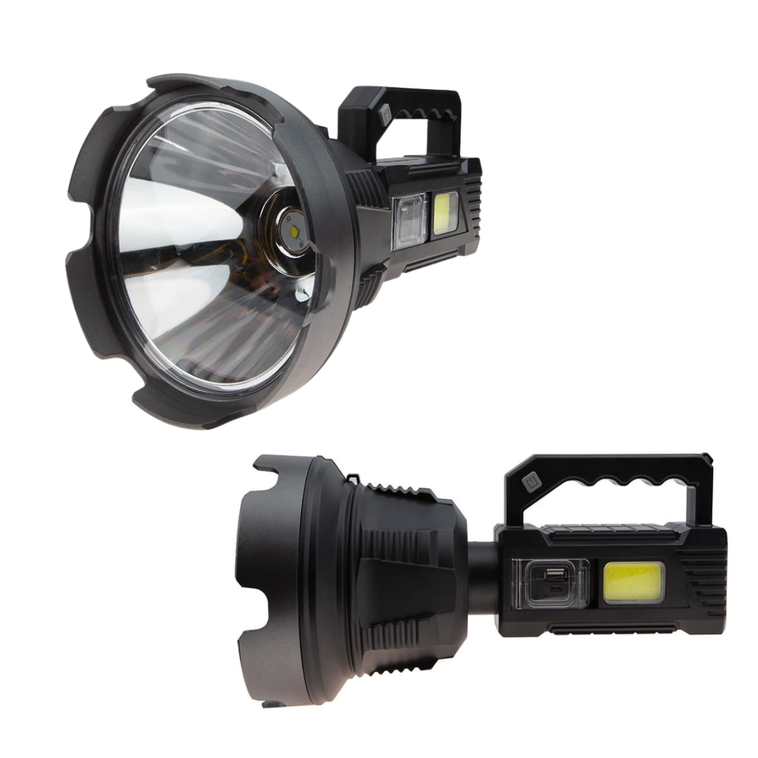 The COBA CB-T300 is a durable, large handheld flashlight equipped with a CREE XHP90 diode offering up to 100,000 hours of lifespan and dazzling brightness. It features two light sources: a powerful spot beam for long-range visibility and a COB side panel for softer lighting. With multiple lighting modes (100%, 50%, Strobe, and Red Signal), a built-in powerbank, and up to 6 hours runtime, this flashlight is perfect for home, camping, hiking, fishing, or workshop use.