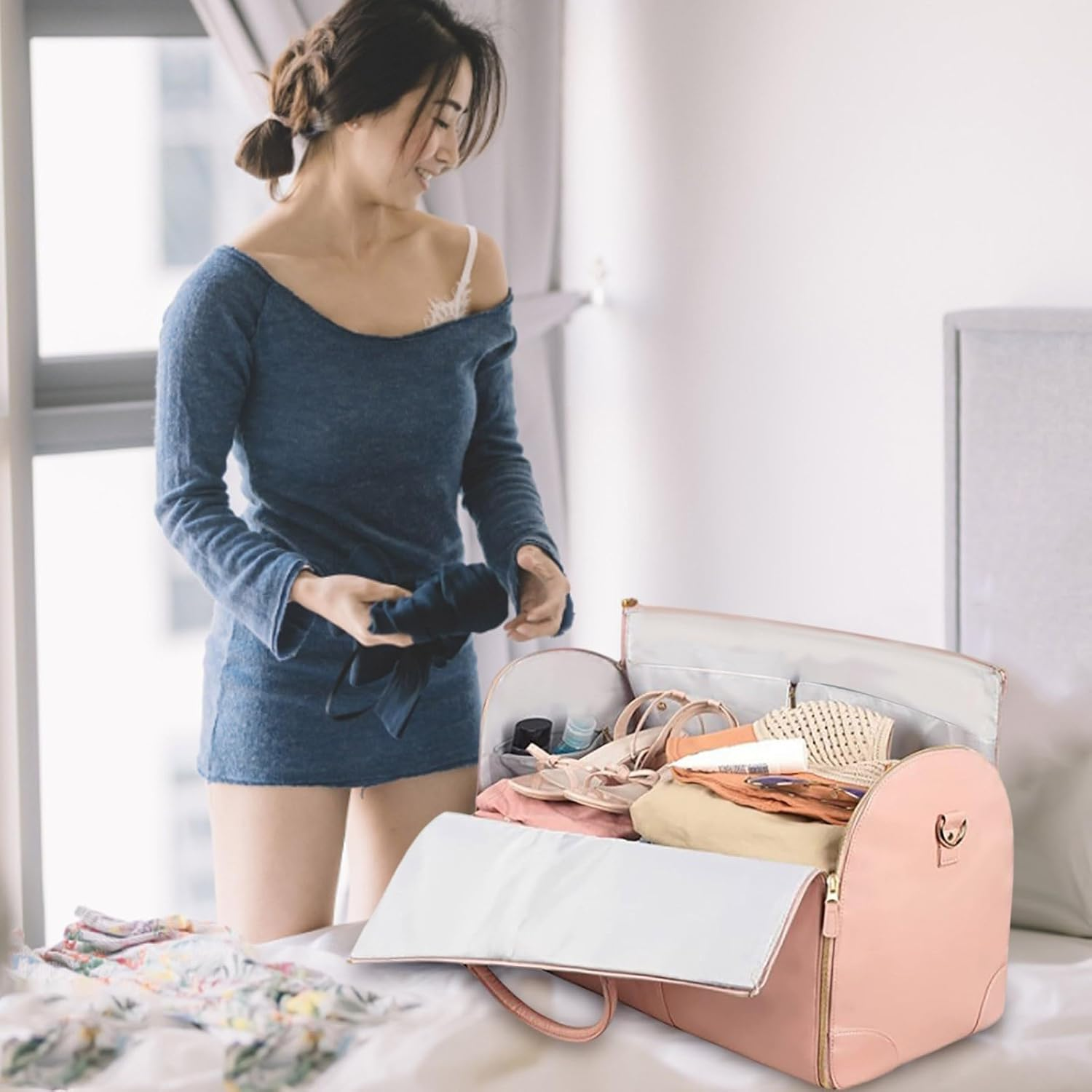 شنطة سفر كبيرة ومرتبة بتصميم جلد PU مقاوم للماء، بتيجي مع مقسم ذكي وبقلبها سعة كافية لتاخد كل أغراضك بسهلة، وبنفس الوقت قابلة للطي وسهلة التخزين.